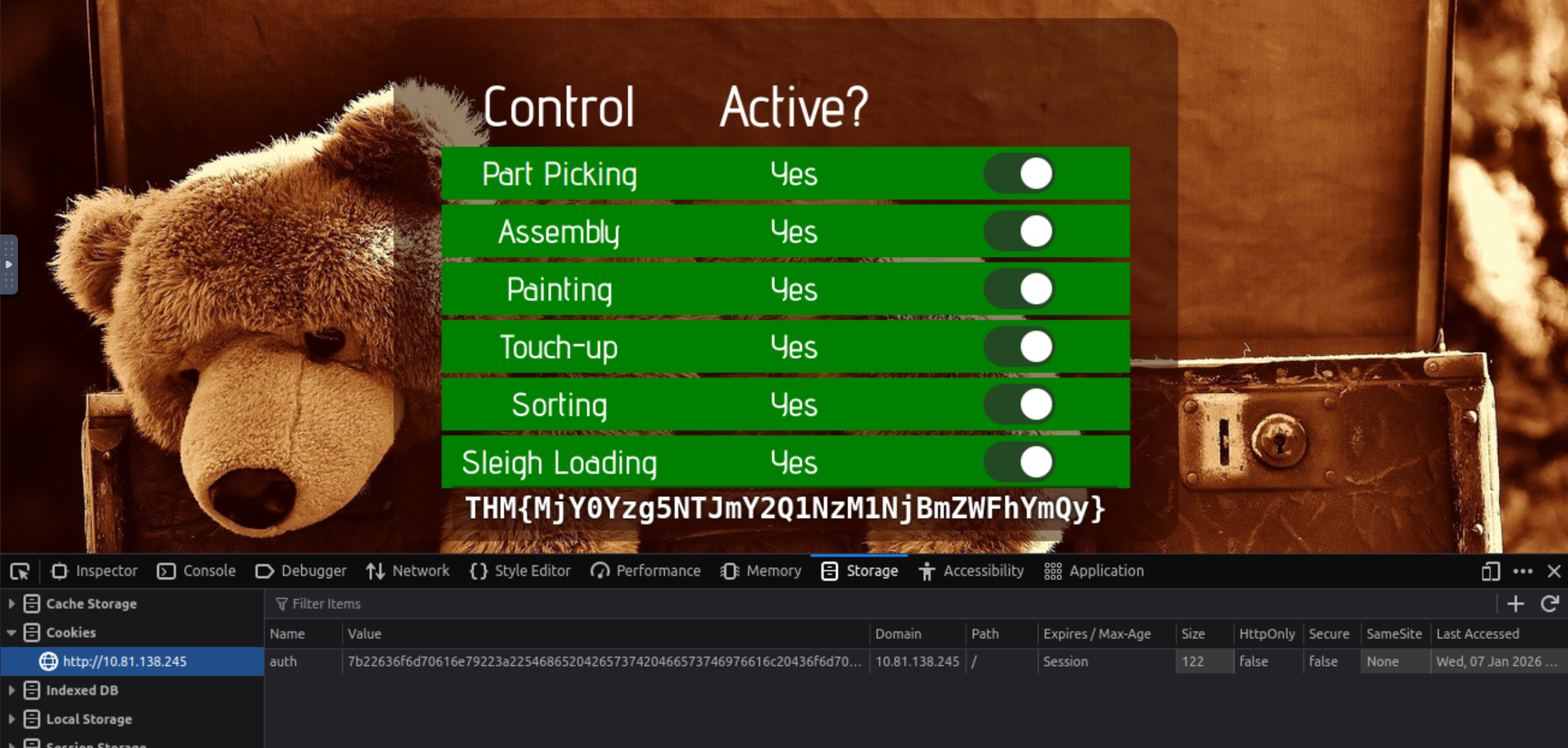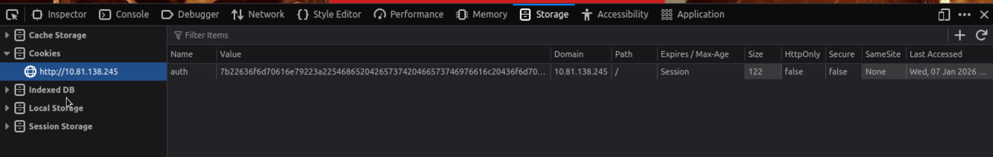After creating an account we can log in and get the cookie using the storage Tab in the dev tools (F12)