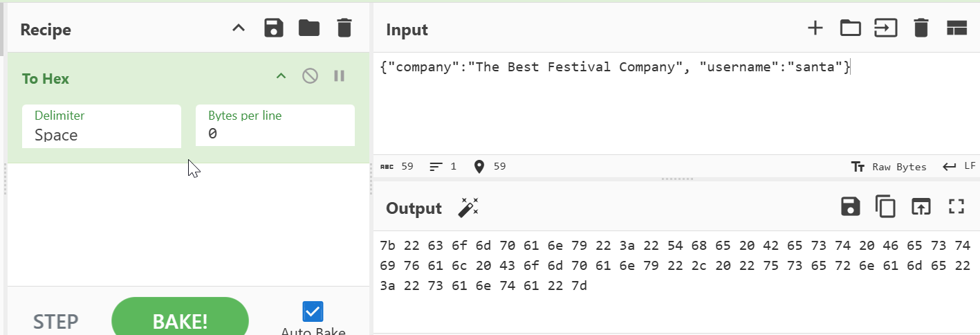 By decoding the hex we can see that one part contains the username. So we can simply replace admin with santa and use CyberChef’s “To Hex” recipe.