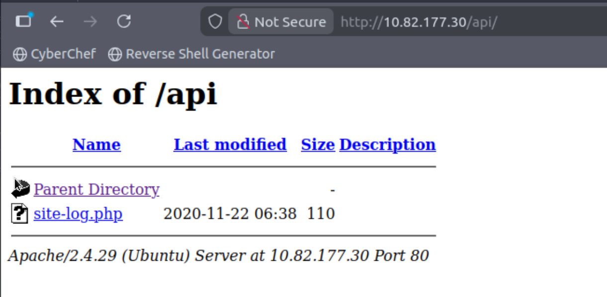 Use GoBuster (against the target you deployed – not the shibes.xyz domain) to find the API directory. What file is there?
