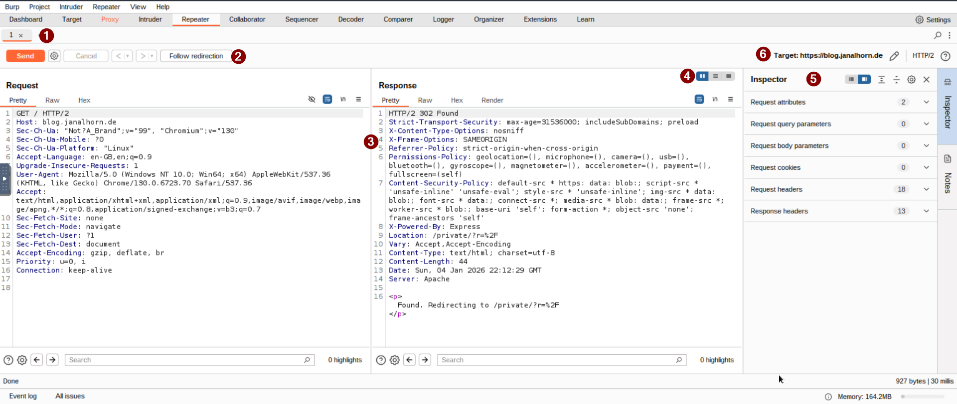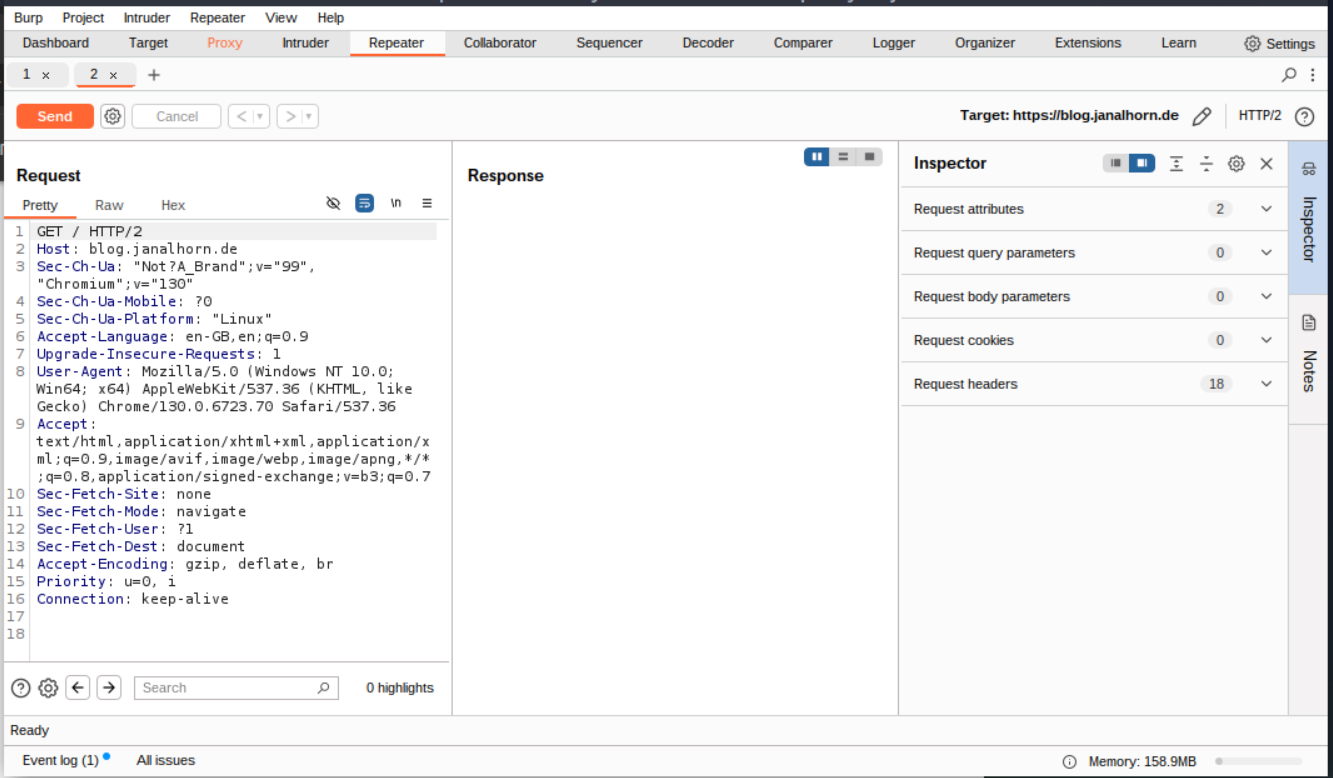 Switch to the Repeater tab, and you’ll see your captured request in the Request view. The Target and Inspector sections will show details about the request, but there’s no response yet.