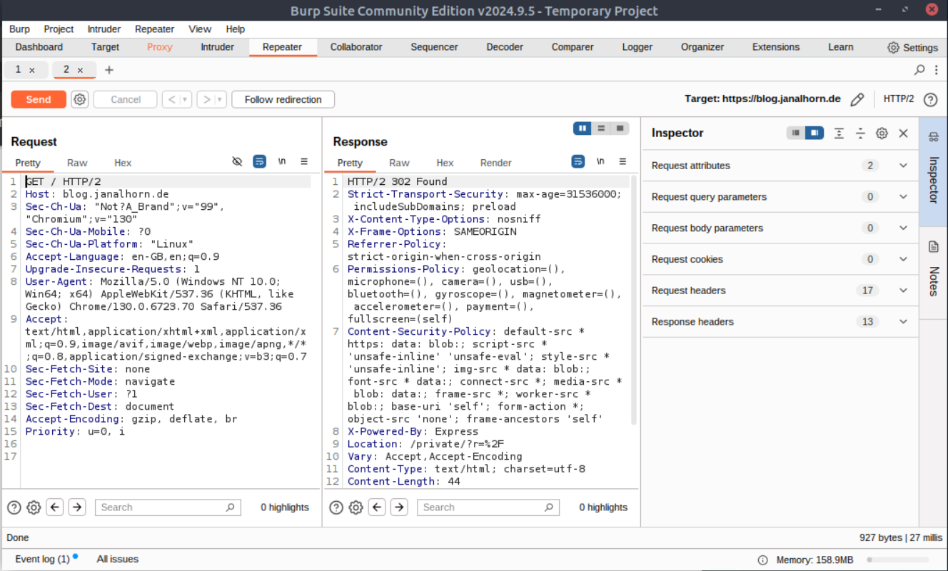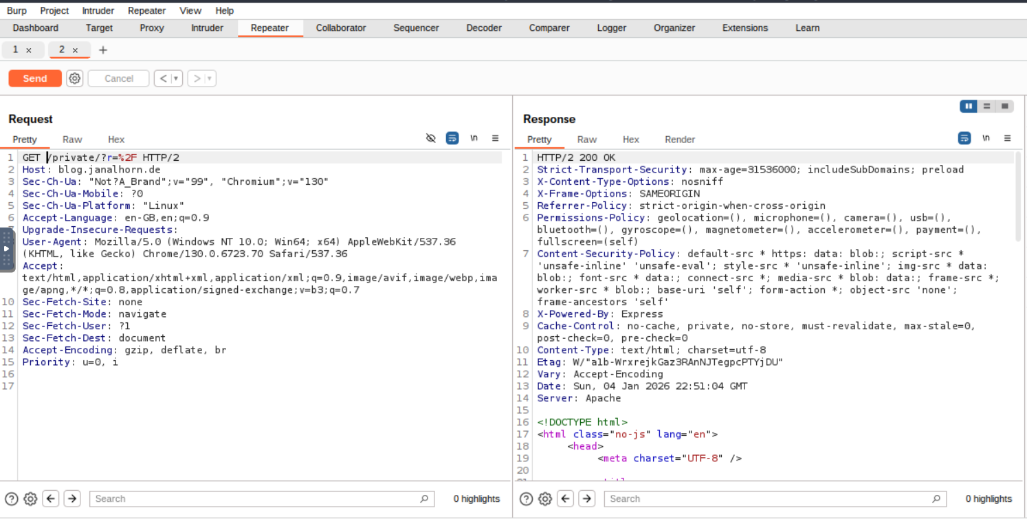 For example, changing the Get Request from /to /private/?r=%2F will return a response where the header now shows HTTP/2 200 OK.
